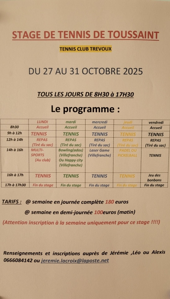 Le club de Trévoux organise, par l’intermédiaire de Jérémie LACROIX, un stage ouvert à tous pendant la première semaine des vacances de la Toussaint…. Ces stages permettent à vos enfants de travailler tennistiquement les matinées avant de faire des activités...